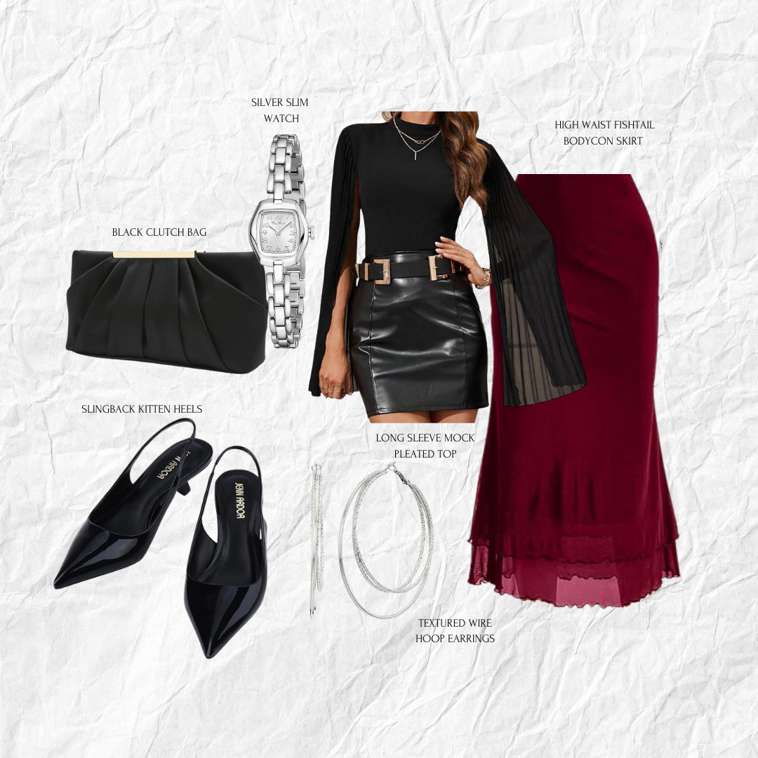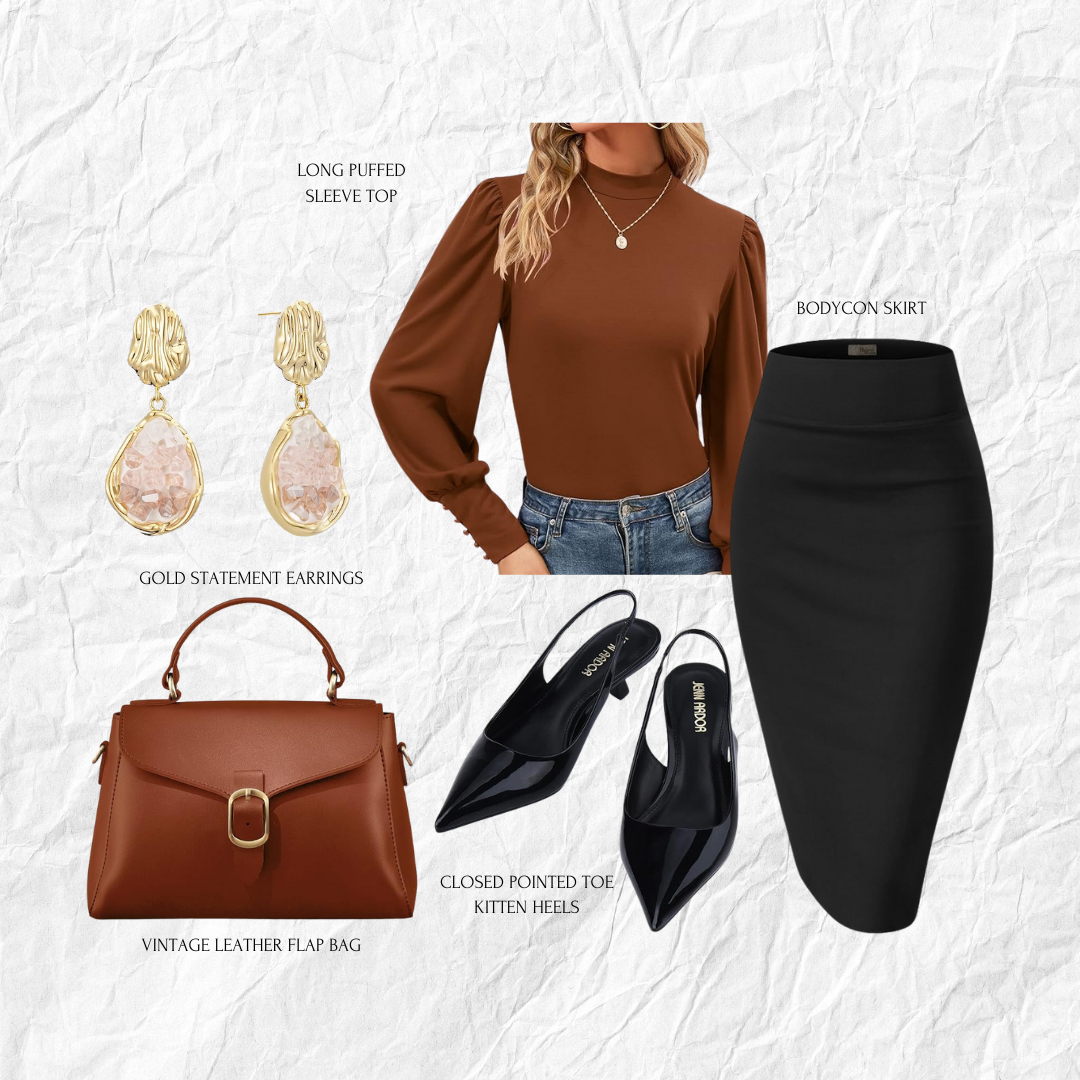 The pairing of a long puff sleeve top with a bodycon skirt perfectly accentuates an hourglass shape, drawing attention to the waist and creating a balanced, flattering silhouette. Combining black and brown tones gives this outfit an effortlessly chic fall look, offering both warmth and elegance for the season. Perfect for a stylish yet cozy outfit, this ensemble transitions seamlessly from day to night.
