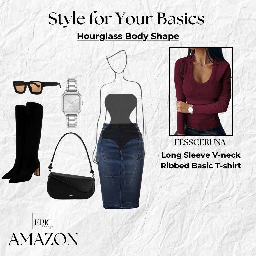 Style Tip: For an hourglass shape, a burgundy V-neck long-sleeve top paired with a knee-length denim skirt beautifully highlights your curves. Complete the look with knee-high black suede boots for a stylish, balanced outfit that accentuates your waist and elongates the legs.