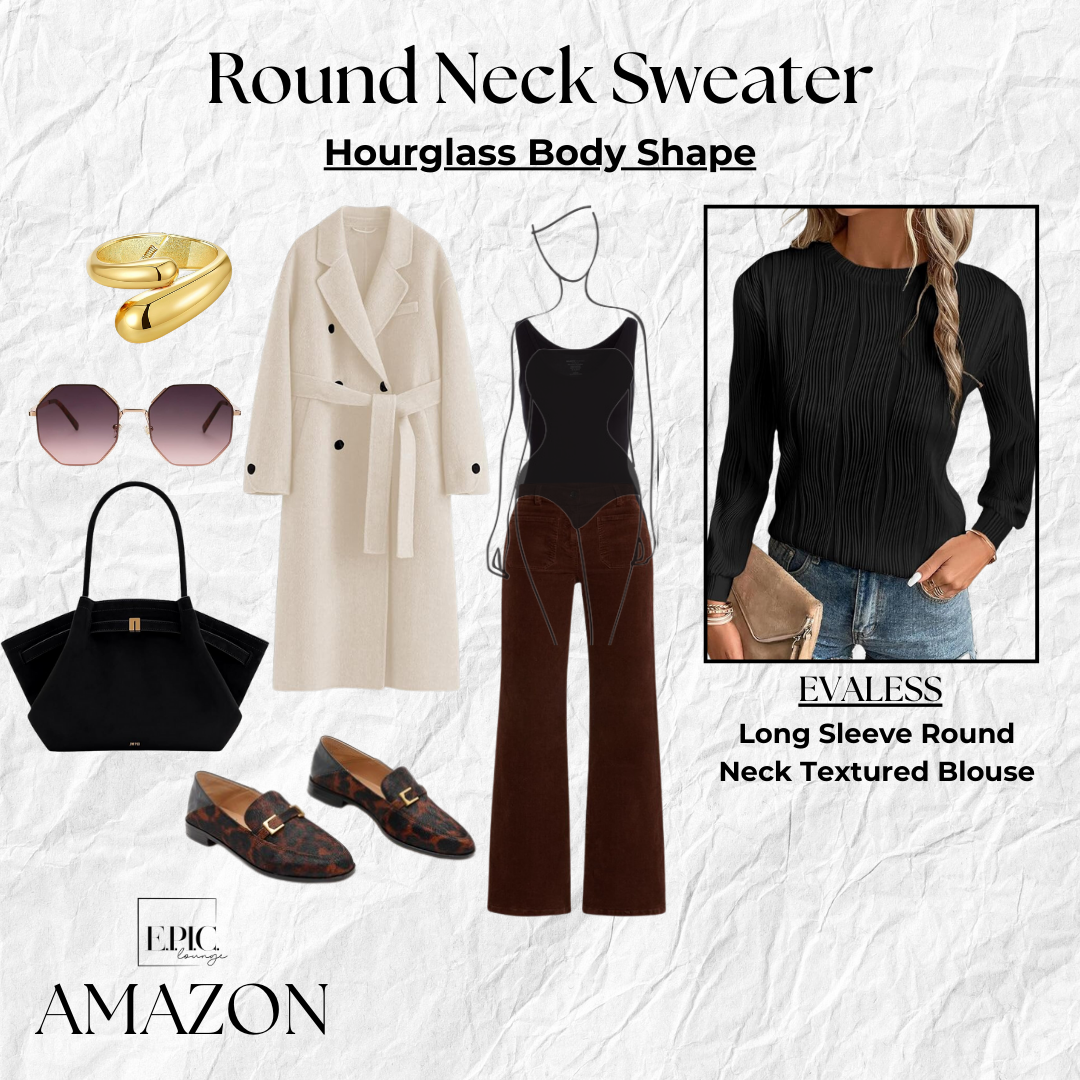 Style Tip: For an hourglass shape, style a black textured round-neck sweater with dark brown boot-cut corduroy pants to accentuate your natural curves. Pair with turtle loafers for a unique touch, and layer with a cream-colored sweater jacket to add lightness and balance to the look. This combination enhances your silhouette while adding warmth and texture.