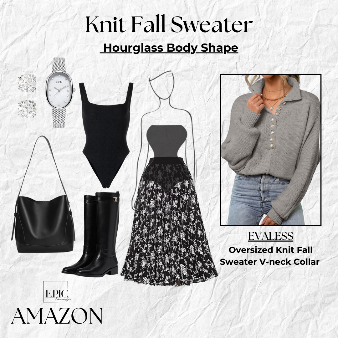 Style Tip: For an hourglass shape, a chunky grey sweater layered over a fitted black bodysuit highlights your waist while balancing your proportions. Pair with a pleated black skirt with white flowers to add soft movement, and finish with ankle booties for a polished, flattering look that showcases your curves.