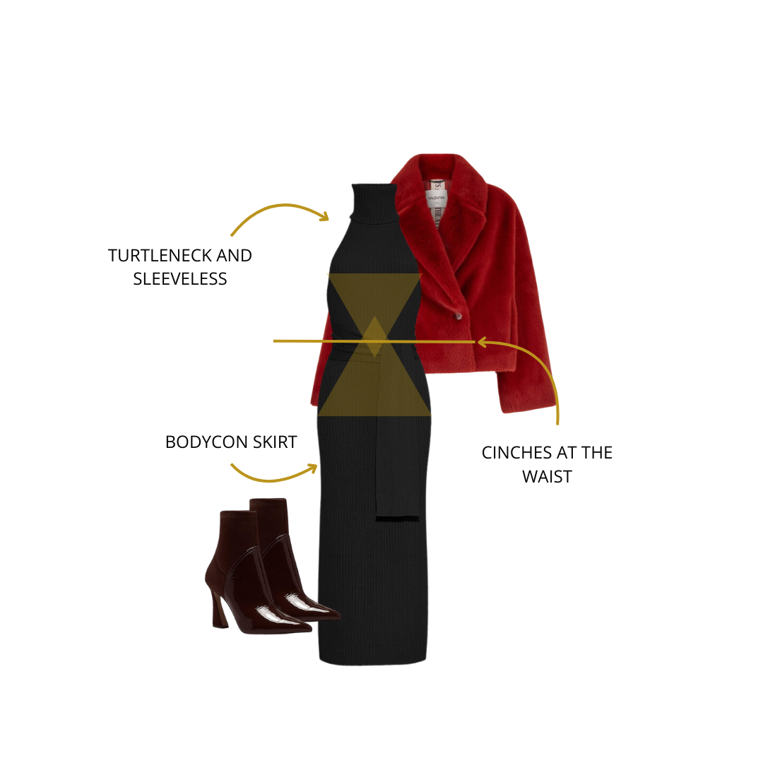 Ideal for fall layering, this black turtleneck dress is a must-have in your wardrobe. Paired with a bold red cropped coat, it showcases how a black inner can effortlessly elevate your look with any colored outer layer. Perfect for hourglass body shapes, this combination ensures a chic and flattering silhouette all season long!