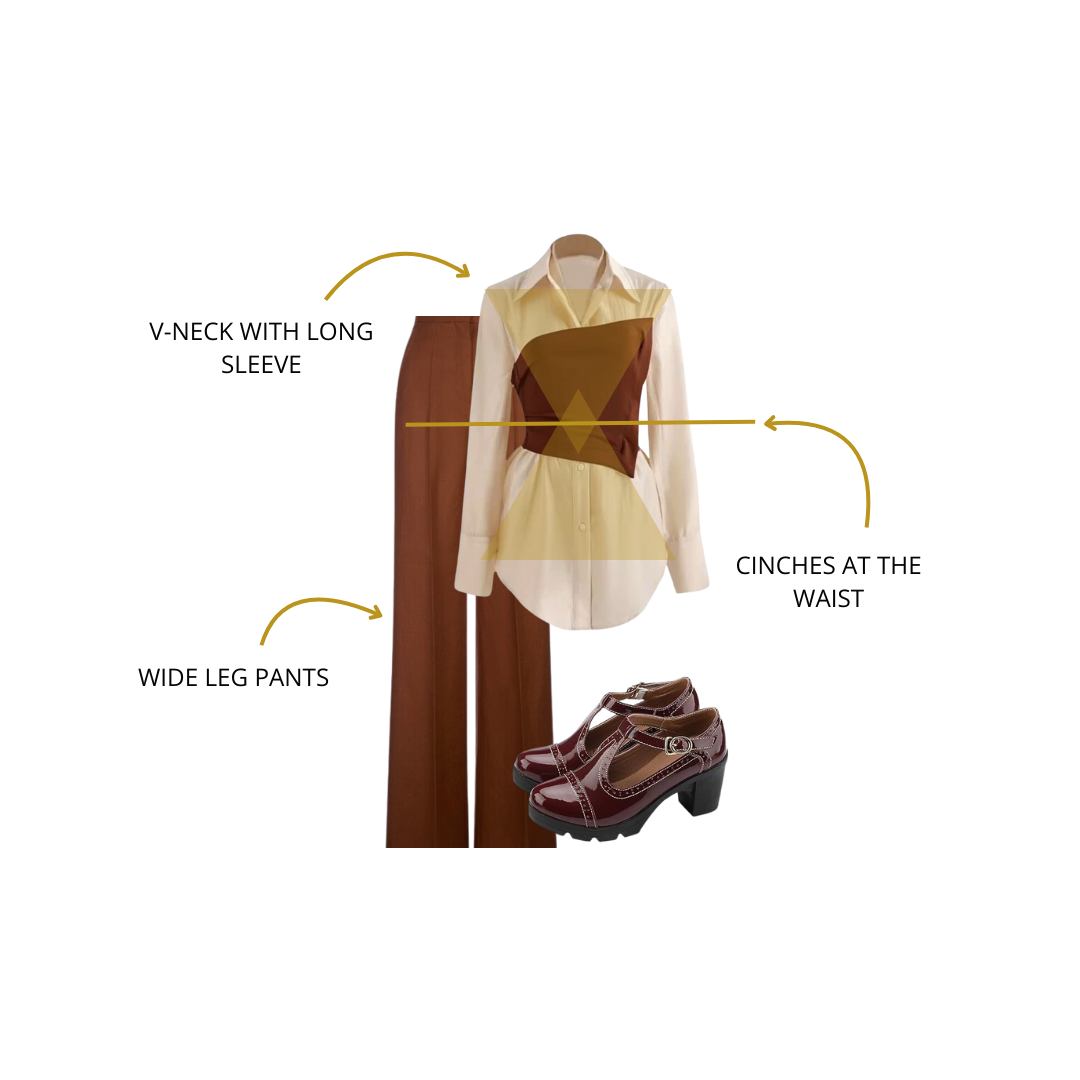 Embrace the essence of fall by opting for neutral shades like this beige long sleeve and brown wide-leg pants. This stylish pairing captures the season’s cozy vibes while perfectly complementing hourglass body shapes, accentuating your curves with effortless comfort and elegance.